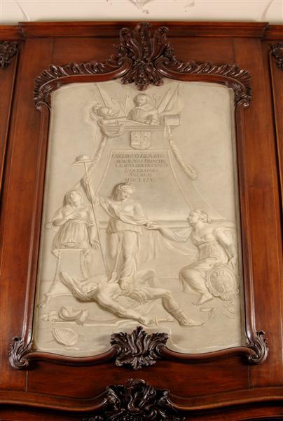 Achter een altaar, waarop een vuur brandt, staan twee vrouwenfiguren, Godsdienst en Vrijheid, waarvan de laatste aan de stedemaagd van Den Bosch de hand toesteekt. De boeien vallen hierbij van haar armen. Vrijheid met een hoed op een paal (in het ouder Rome werd een slaaf die de vrijheid had verkregen een hoed opgezet) vertrapt een krijgsman met afgebroken zwaard. Onder het hoofd van de verslagene zien we een helm en een mijter. Bovenin het schilderij een borstbeeld van Frederik Henderik, waaronder in Latijn het opschrift: gewijd aan Frederik Henderik, prins van Oranje Nassau, de bevrijder van de stad 's-Hertogenbosch anno 1629.
