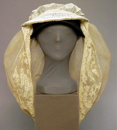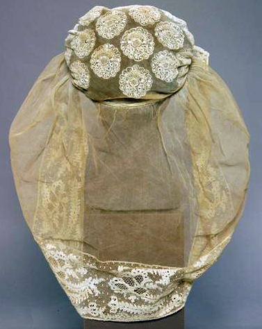 Kanten muts. Geplooide voorstrook van machinale kant, aan de voorkant verstevigd met een strookje meegenaaide tule. Plooien verstevigd met lichtblauw karkas, en aan de voorkant dik wit laiton. Aan de achterzijde is een witte draad door de plooien geregen. Smal schildje (1 cm breed) van tule, rondom afgezet met een smal bandje. Bodem van tule met rozetten in plumetis borduurwerk. Tulen achterstrook afgezet met een brede strook machinale kant (Maaskantse, 10 cm breed). Op de binnenkant van de onderzoom van de bodem is een geklost laddertje genaaid waardoor 2 veterbandjes geschoven zijn.