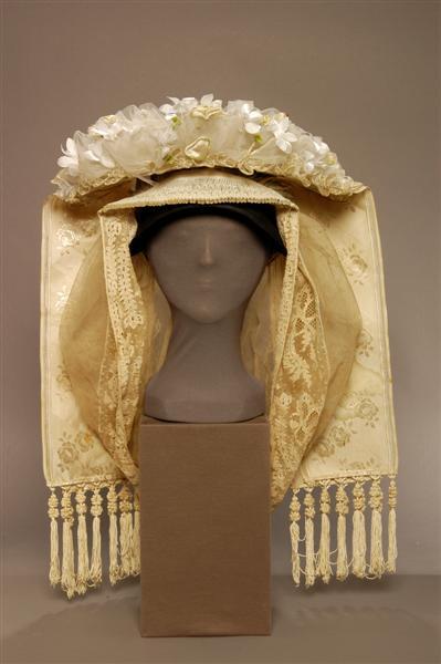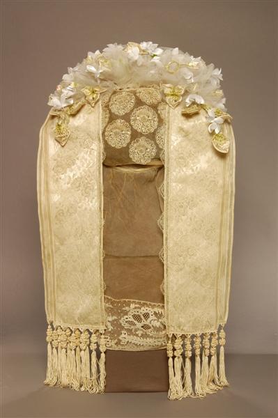Behoort bij inv.nr. 11896. Romp van stijf gesteven wit gaas, verstevigd met dik laiton. Oren elk gevormd door 2 rondgebogen dikke laitondraden. Op de onderzijde is een elastiekje vastgehecht. Rondom de romp een kantje in stolpplooien opgenaaid. Strikken van rayon met ingeweven schuine strepen in satijn en ribsbinding, en een bloemmotief. Langs de zelfkanten een open randje. Onderaan rayon franje. Over de strikken, over de gehele lengte, stroken machinale kant. De romp is versierd met bloemen en tule. De oorspronkelijke bloemen zijn gemaakt van rayon, met rayon beklede glazen bolletjes, versieringen van galon en glazen steentjes. De tule is hoogstwaarschijnlijk vernieuwd, de witte ("geknipte") bloemen en de groene droogbloempjes (?) zijn later aangebracht. Veel groen in de bloemen!