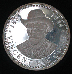 - BeschrijvingVoorzijde: portretbuste van Vincent van Gogh, "en trois quart" naar links, met een hoed op het hoofd. Om het geheel een parelrand. Keerzijde: het gemeentewapen van Nuenen. Om het geheel een parelrand. Uitgegeven door de gemeente Nuenen ter ere van het eeuwfeest van het Nuenense verblijf van Van Gogh.