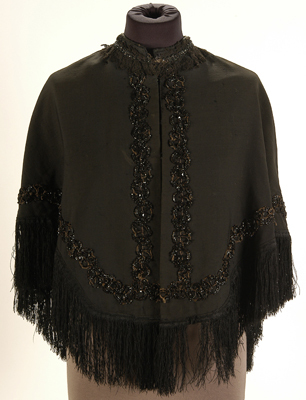 - BeschrijvingZwarte wollen merinos pelerine. Model met punt middenvoor en hoog opgesneden naar de schouders. Rondom afgezet met gitband. Langs de hals een zwart machinaal kantje. Langs de onderrand zijden franje. Voering van beige keperkatoen. Op de voering 3 losse lapjes.
