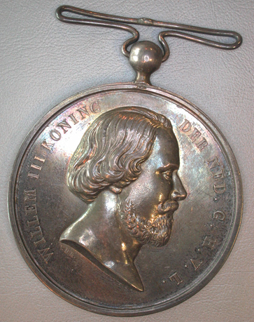 Ronde penning met knop en draagspeld Vz: Borstbeeld van Willem III naar rechts. Daaromheen het osmchrift. Kz: In het veld een door een oranje- en een lauwertak omgeven rol perkament, met daarboven een kroon. Langs de rand een opschrift op de rol eveneens een opschrift.