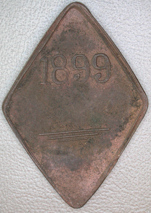 Ruitvormige penning zonder gat en ring. Vz: Gekroond stadswapen midden boven een parelcirkeltje ter aanduiding van het gat voor de ring. Om het geheel een parelrand. Kz: In hoog reliƫf het jaartal 1899. Daaronder drie horizontale lijntjes waarboven het nummer diende te worden ingeslagen. Om het geheel een doorlopende rand