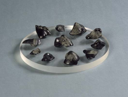 11 bewerkte stenen, oplopend in grootte, op perspex schijf.