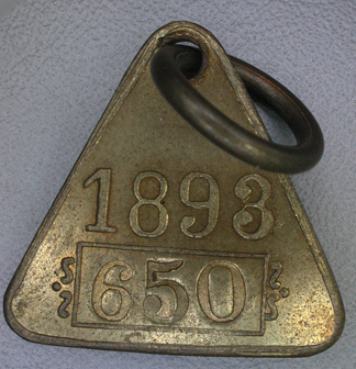 - BeschrijvingDriehoekige penning met gat en ring Vz: Gekroond stadswapen geflankeerd door rankenmotieven. Om het geheel een doorlopende rand. Kz: In hoog reliƫf het jaartal 1893 daaronder is in een kader het nummer 650 ingeslagen. Om het geheel een doorlopende rand