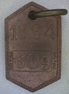 Zeshoekige penning waarvan de verticale zijden langer zijn dan de overige zijden. Middenboven gat en ring Vz: Gekroond stadswapen om het geheel een parelrand. Kz: In hoog reliƫf het jaartal 1894 daaronder is in een kader het nummer 609 ingeslagen. Om het geheel een parelrand