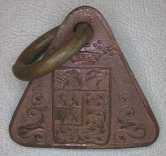 - BeschrijvingDriehoekige penning met gat en ring Vz: Gekroond stadswapen, geflankeerd door rankenmotieven. Om het geheel een doorlopende rand Kz: In hoog reliƫf het jaartal 1898 daaronder is in een kader het nummer 84 ingeslagen. Om het geheel een doorlopende rand