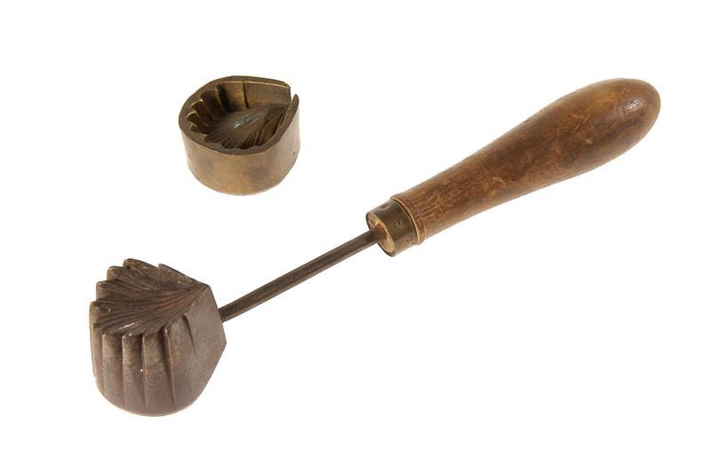 - BeschrijvingVoor het in model persen van bloemen en blaadjes zoals bij poffers, hoeden enz. Gietijzeren mallen met messing contramallen. Bladmotief. Met rood gebeitst heft.