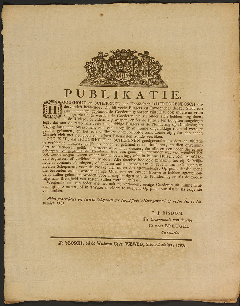 - BeschrijvingPublikatie van de schepenen van 's-Hertogenbosch over het visiteren van huizen na de plundering van de stad.