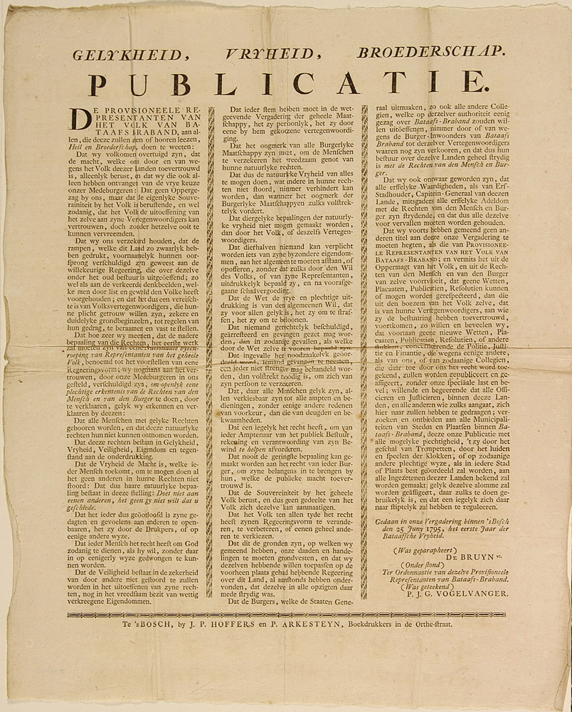 - BeschrijvingPublikatie van de Provinsionele representanten van het volk van Bataafs Brabant van de Rechten van de Mens en de Burger.