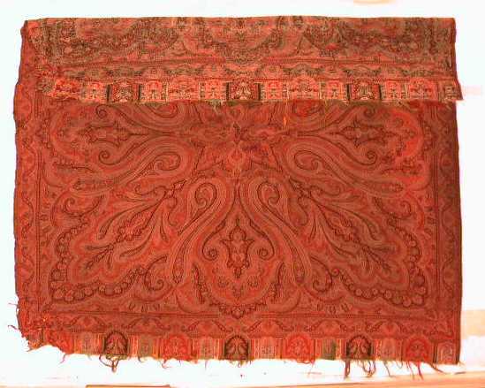 Wollen kashmirsjaal in 6 kleuren. Inslag: rood, oranje, groen, licht blauw-groen, wit, zwart. Ketting overwegend rood bedrukt, in de harlekijnranden in de kleuren van de betreffende dominerende inslag (rood, groen, geel, lichtblauw-groen, wit in de zwarte mihrab is de ketting echter groen). Symmetrisch decor bestaande uit buta's en fantasiemotieven.Daaromheen een rand met symmetrisch fantasiemotief. Een spiegel ontbreekt. Aan boven- en onderzijde een harlekijnrand. Zelfkanten van groene zijde. Franje gevormd door de kettingdraden. Over een breedte van 10 cm vanaf de zelfkant is de franje geknoopt. Grondweefsel in platbinding. Franjeweefsel in keperbinding 1/2. Kettingdichtheid 24 dr/cm. Inslagdichtheid 60 dr/cm.