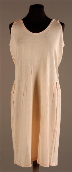 - BeschrijvingOnderjurk van zalmkleurig geplateerd tricot. Viscoserayon en katoen. Ronde hals en armsgaten, versierd met ingenaaide schulpjes. Op heuphoogte aan beide zijden een schuine naad met aangerimpeld rokdeel. Schouderbanden later ingekort. Vergelijk met inv.nr. 12430.