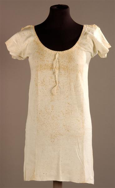 - BeschrijvingWit katoenen interlock hemd met ronde hals en kleine ingezette mouwtjes. Hals rand versierd met ingestikte schulpjes. Door het zoompje is een wit viskoserayon veterbandje geregen. Lijf gemaakt uit rondgebreid interlock. Alle naden en zomen genaaid met een bovendraad van glanzend wit viskoserayon.