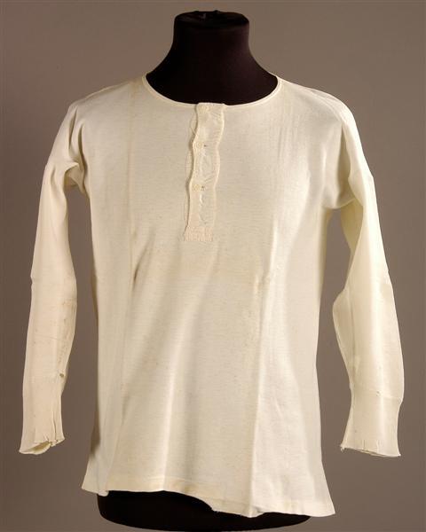 Wit katoenen interlock hemd met lange mouwen. Ronde halsuitsnijding, in het rugpand verstevigd door een aangeknipt en teruggeslagen halfrond beleg. Split middenvoor met beleg van witte keperkatoen te sluiten met 3 parelmoeren knoopjes en 3 knoopsgaten. Voor- en achterpand zijn uit een stuk geknipt met rechte zijnaden en armsgaten. De mouwen zonder kop zijn recht in de armsgaten gezet. De ondernaden van de mouwen lopen schuin naar de oksels toe. Manchetten in 1r1v ribtricot, aangezet met overlockstiksl. Mogelijk behorend bij inv.nr. 35.
