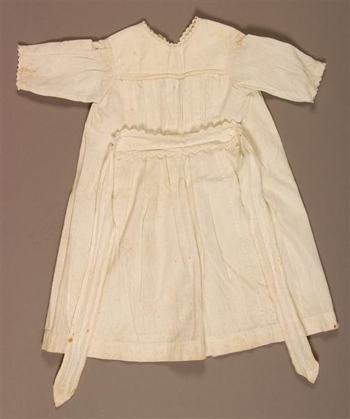 Nacht- of dagponnetje van witte katoen van ingeweven satijnstrepen. Schouderpas van effen witte katoen. Rond halsje, afgezet met geschulpt band. Lange mouwtjes, eveneens afgezet met geschulpt band. Lijfje en rok aan een stuk geknipt, aan de voorkant met 5 stolpplooien en aan de achterkant gerimpeld aan de pas gezet. Tussen pas en plooien een machinaal kantje. Op taillehoogte, ter breedte van de plooien, is een band genaaid. De band is rondom afgezet met een kantje van broderie-anglaise. Aan de zijkanten van de band zijn lange strikbanden bevestigd. Het ponnetje is aan de achterzijde open en sluit op de pas met 2 glazen knoopjes en 2 knoopsgaten.