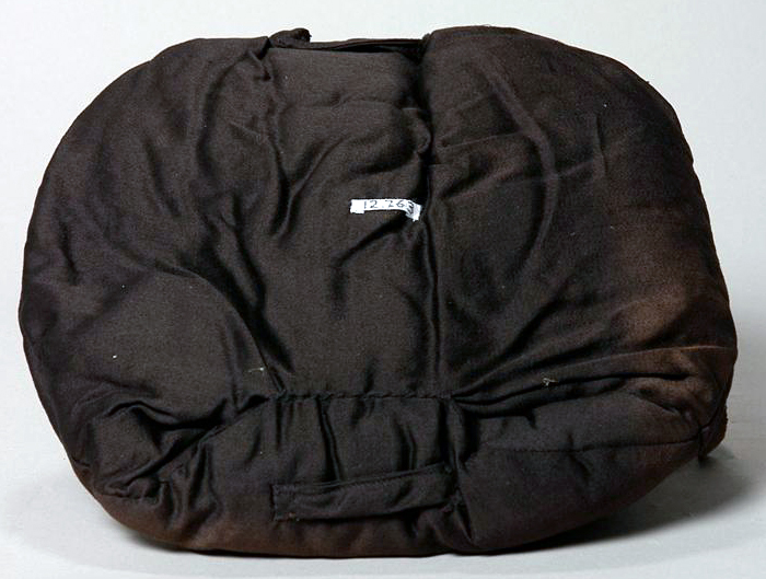 - BeschrijvingZwart satinet kussentje. Aan een zijde omgeslagen en vastgenaaid. Op de omslag een lusje. Aan de tegenoverliggende zijde een lusje dat de rand van het kussentje samentrekt. In 1986 ongenummerd aangetroffen.