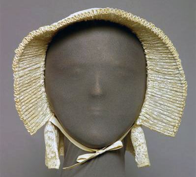 Zgn. neepjesmuts. Brede geplooide voorstrook van machinale kant. Plooien verstevigd met karkas. Voorstrook gezet aan brede band van geborduurde tule. Bodem van dezelfde geborduurde tule. Borduurwerken: rozetten in plumetiswerk. Rozetten ter grootte van guldens. Langs de onderrand van de muts een brede grof geplooide strook van dezelfde kant als gebruikt voor de voorstrook. Plooien bijeen gehouden met een doorgeregen draad. Naden aan de binnenzijde verstevigd met smal katoenen band. Door de zoom van de onderkant van de bodem zijn 2 katoenen bandjes geschoven. Striklinten van katoen.