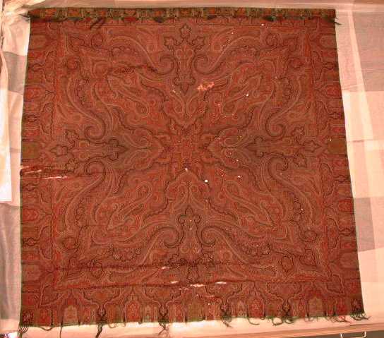 Wollen omslagdoek. Inslag in de kleuren rood, oranje, wit, zwart en 2 tinten groen. Ketting bedrukt, grotendeels rood, ter hoogte van de harlekijnranden aan boven- en onderzijde rood, oranje, wit en 4 tinten groen. In het midden een 'ster' waaromheen grote palmetten. Langs alle zijden een harlekijnrand. Franje gevormd uit de kettingdraden in de kleuren van de harlekijnranden. In 1986 ongenummerd aangetroffen. Voor algemene opmerkingen zie inv.nr. 660.