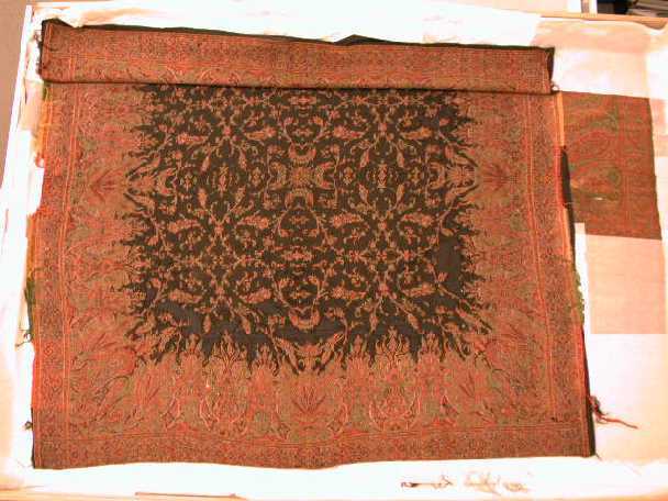 Omslagdoek met zijden ketting en wollen inslag. Ketting bedrukt, overwegend zwart, ter hoogte van de smalle randen langs boven- en onderkant rood, groen, geel en zwart. Inslag in de kleuren rood, oranje, groen, zwart en lichtblauw. In het midden een grote, vierkante zwarte spiegel geheel versierd met bloemenranken. Om de spiegel een brede rand met bloem- en palmetmotieven in de kleuren van de inslag. Daaromheen, langs de 4 zijden van de doek, een rand met fantasiemotieven in alle kleuren. Aan beide zijden een zwarte zelfkant. Aan boven- en onderkant aangeweven effen randjes in verschillende kleuren, met franje gevormd uit de kettingdraden in bijbehorende kleuren. Grondweefsel in keperbinding. Voering van zwarte katoen.