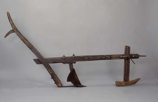 Met kleine schaar van moderne vloerplaat (met ruitpatroon op achterzijde). Werd gebruikt om vorens te maken en te dichten om aardappels te poten.
