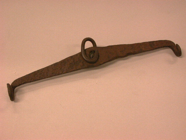 - BeschrijvingPlat ijzeren disselboom met sterk gebogen uiteinden en een gat in het midden waar omheen een ijzeren krul is vastgesmeed (los onderdeel). Gebruikt om een trekhond voor een wagen te spannen (broodkar e.d.).