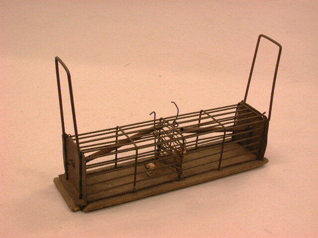 - BeschrijvingLangwerpige dubbele kooival. Langwerpige kooitje met aan beide uiteinden deurtjes die d.m.v. een veer aan de kooitjes verbonden zijn. Als de deurtjes geopend zijn, staat de vorm onder spanning.