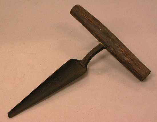 - BeschrijvingConische lepelboor met een groot boordeel en gebogen steel tussen vierkante platte kolf (en handvat) en het booruiteinde.