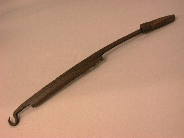 - BeschrijvingTypisch klompenmakersgereedschap dat bevestigd wordt aan een sok en waarmee de klomp vormgegeven wordt. Dit exemplaar heeft een angel waaromheen het houten handvat zit (extra bevestigd door een ijzeren band) in de lange weg. Het blad is flink versleten.