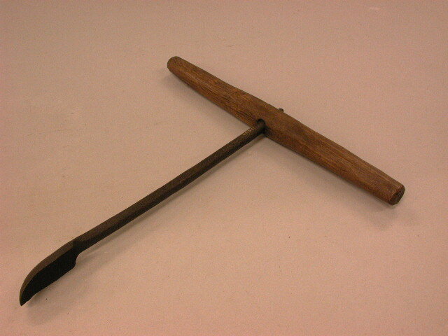 - BeschrijvingLepelboor waarvan de steel door het handvat heensteekt. Het boorblad heeft een wat spits punt en merkje (in het blad). Om de voorvoet van de klomp uit te hollen.