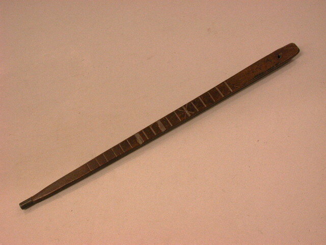 - BeschrijvingEen stok met een platte voorzijde en halfronde achterzijde. In de voorzijde zijn maataanduidingen als (dwarse) strepen en sterren gekerfd en uitgestoken om de punt zit een (los) bronzen bandje. Om de diepte van de uitgeholde voetruimte van een klomp te meten.