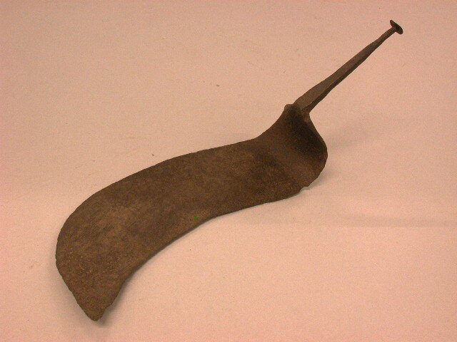 - BeschrijvingSikkel speciaal voor varens en onkruid. Breed plat ijzeren blad in sikkel-vorm met puntig einde. Ander einde buigt halfrond om naar boven en eindigt in een schuinstaande pin met knop. Het houten handvat ontbreekt. Met name bekend in bosbouw.