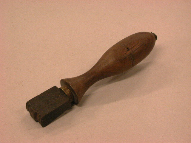 - BeschrijvingLangwerpig stuk hout dat in het midden smaller wordt. In het midden een geultje (hout is weggebrand). Aan de uiteinden een ribbel. Misschien om draad in was te zetten.