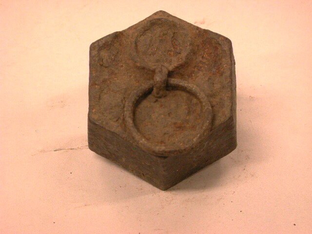 - BeschrijvingZeshoekig ringgewicht van 1 kilo, met losse (beweegbare) ring. Bovenzijde heeft geen loden vulsel noch een gewichtsaanduiding. Aan de onderzijde is het ijkgat gevuld met lood en voorzien van ijktekens (onleesbaar).