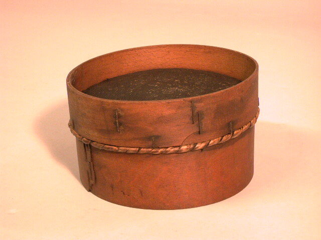 - BeschrijvingMeelzeef gemaakt van brede billen spaanderhout, vlechtsel van haar (paardehaar?). De band is iets gebarsten.