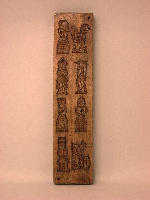 - BeschrijvingHouten koekplank, éénzijdig bruikbaar. Acht voorstellingen (koekvormen) in twee vertikale rijen in het hout gesneden. Van boven: vrouw met mand, haan (profiel), man met steek, man met mand (profiel), vrouw met muts, vrouw (frontaal), man met hoge hoed (frontaal), paard en rijtuig (profiel).
