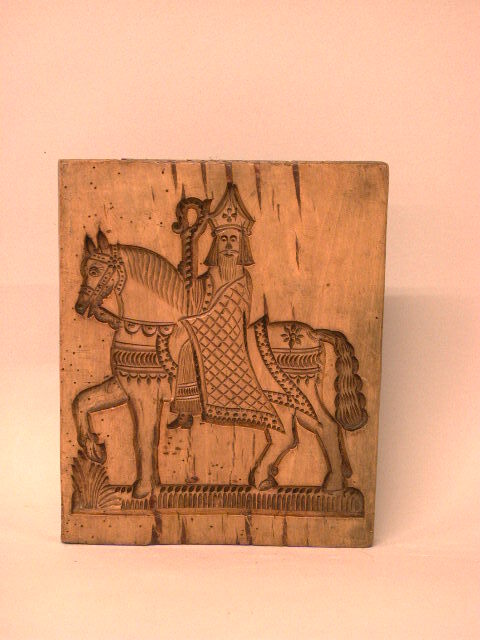 - BeschrijvingHouten koekplank, eenzijdig bruikbaar. Sint Nikolaas met mijter te paard. Er zijn geen kinderen afgebeeld. In de achterkant zijn de letters IB ingebrand.