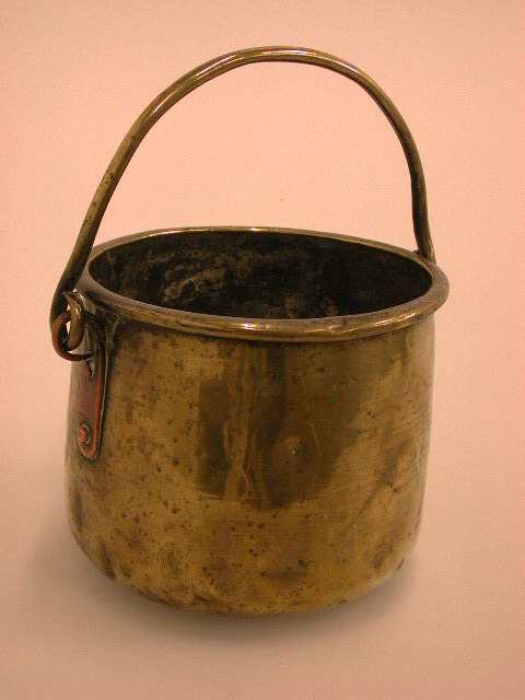 - BeschrijvingKetel met bolle bodem, kaart cylindrisch lichaam met dikke bovenrand. Rood koperen oren en geelkoperen hengsel. Van binnen vertind (kalkaanslag).