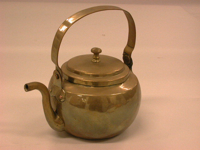 - BeschrijvingGeelkoperen appelketeltje met platte (afgeronde) bodem en sterk gebogen tuit. Vlak gewelfde deksel (iets geprofileerd). Plat ronde knop (in het midden gewelfd). Roodkoperen klinknagels.