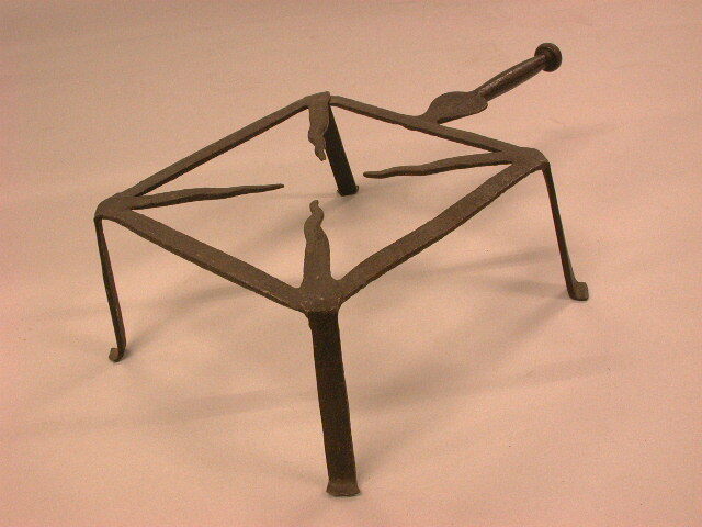 - BeschrijvingVierkante treeft: Vier poten die aan de onderzijde zijn omgebogen en aan de bovenkant naar het midden toe in vlammetjes uitlopen. Steel met knop steel is gedeeltelijk plat en breed (handvat).