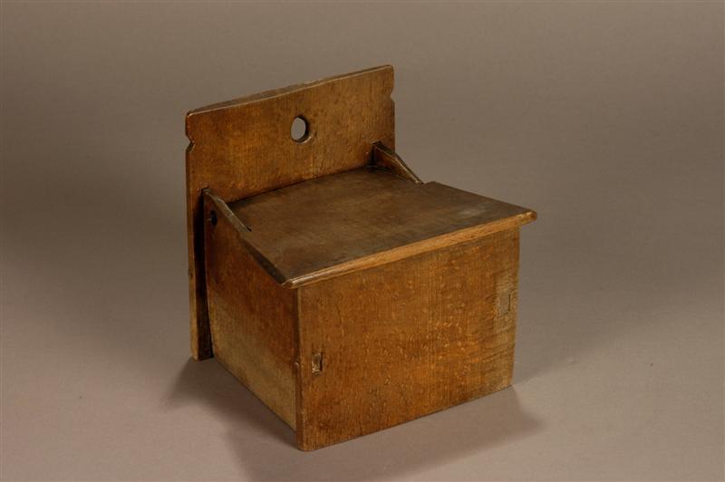 - BeschrijvingHoekige beukehouten zoutdoos die opgehangen kan worden. Achterwand heeft een rond gat voor een nagel. De deksel scharniert d.m.v. houten verbindingen in de zijwanden. De zijwanden hebben een inkepingen in de bovenrand waarin de deksel dichtvalt Diverse pengatverbindingen; ze zijn met nagels bevestigd.