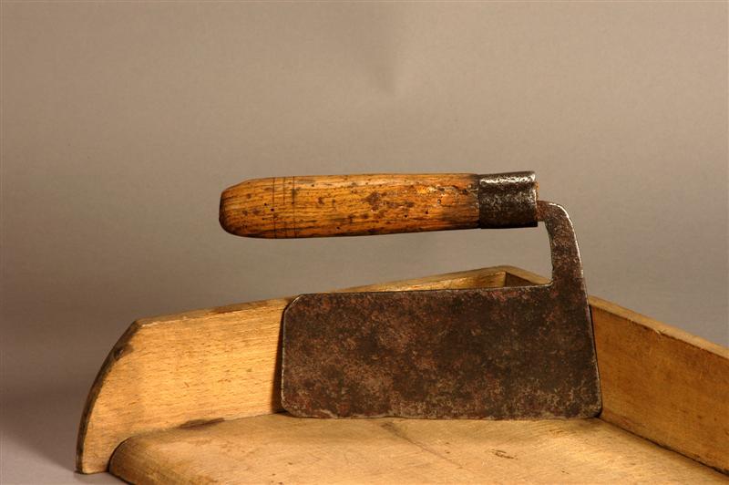- BeschrijvingRechthoekig hakmes. Rechthoekig en recht ijzeren lemmet. Aan één zijde hiervan is een L-vormig houten handvat bevestigd de lange zijde loopt paralel aan het lemmet.