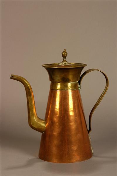 Conische kan met oor in ?-vorm. Oor, tuit, waag, dekselknop en -rand zijn van geelkoper het uiteinde van de tuit is versierd.