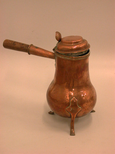 - BeschrijvingKoffiekan met bolle bodem en drie gebogen pootjes (kan op een komfoor geplaatst worden) snel dwarsgeplaatste holle steel met houten handvat scharnierdeksel met duimlip.