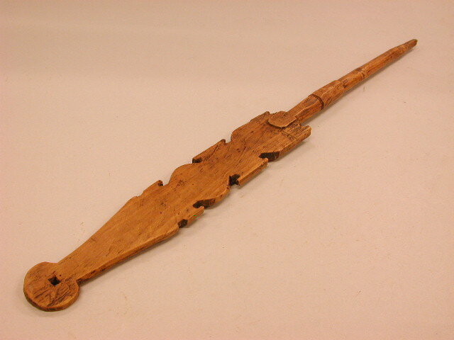 - BeschrijvingEen platte, uit één stuk gesneden spinrok met gefiguurzaagde zijden en een knop-vormige top met oog. De helft van de lengte is een ronde gekerfde steel.