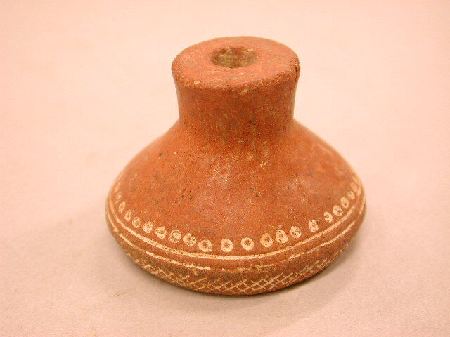 - BeschrijvingKraalvormige spinsteen die vermoedelijk van terra cotta is gemaakt en voorzien is van witte kerfversiering op de rand: strepen en ruiten. Op de steen zit een stikker met de vermelding: CHIN 4.