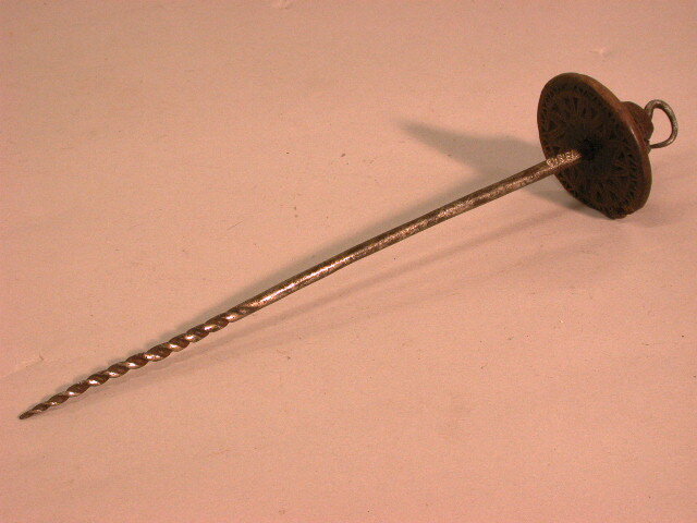 - BeschrijvingTweedelige spil met een conische ijzeren staaf (met schroefpunt) en een conisch houten vliegwiel die aan boven- en onderzijde is ingekerfd met driehoek motieven. De staaf loopt door het hout heen en eindigt in een haakje.