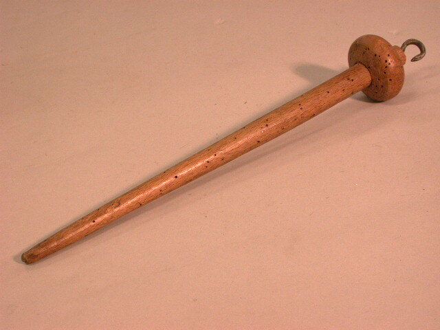 - BeschrijvingDriedelige beuken spil met ronde staaf (met stompe punt) die in een symetrische vliegwiel steekt en voorzien is van een ijzeren haakje. Aan de punt van de staaf zit een grove stip.