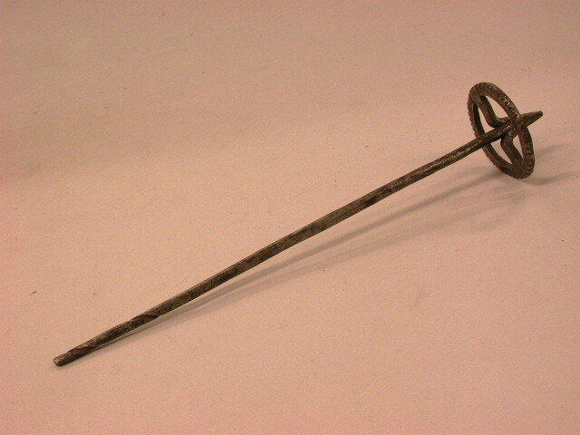 - BeschrijvingGeheel ijzeren spil met een staaf (die in een schroefpunt eindigt) en een radvormig vliegwiel aan de top (geschulpte rand) die dmv de 2 spaken aan de top van de staaf is vastgesmeed.