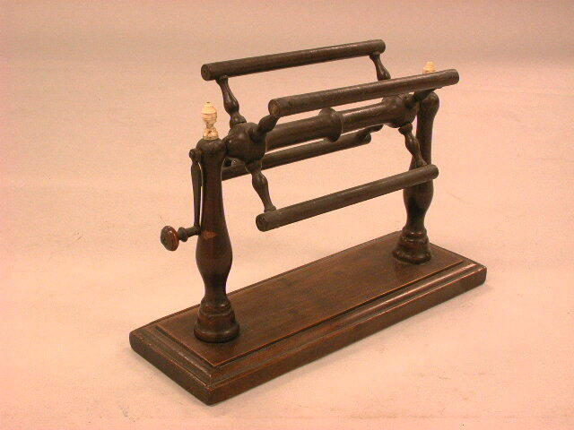 - BeschrijvingHouten haspel, waarschijnlijk voor garen -voet plank met geprofileerde randen -2 gedraaide standers met ivoren knoppen -molen vann kruislatten (aan elke staander 2) verbonden dmv spijlen -ijzeren slinger met een houten knop.