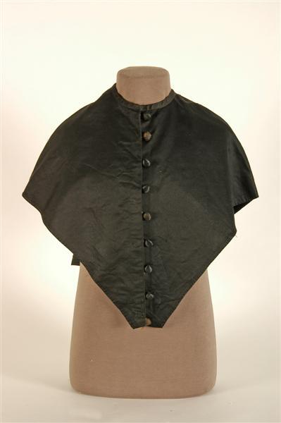 - BeschrijvingPelerine van zwarte zijden satijn. Verlengde schoudernaden. Voorpand naar beneden toe uitlopend in punt. Onderrand achterpand rond geknipt. Sluiting middenvoor met 9 zijden knopen en 9 koordlussen. Voering bruine katoen. Op voering middenachter, lip van voeringstof. Zoom achter aan beide zijden ingeslagen. Gedeeltelijk handgenaaid.